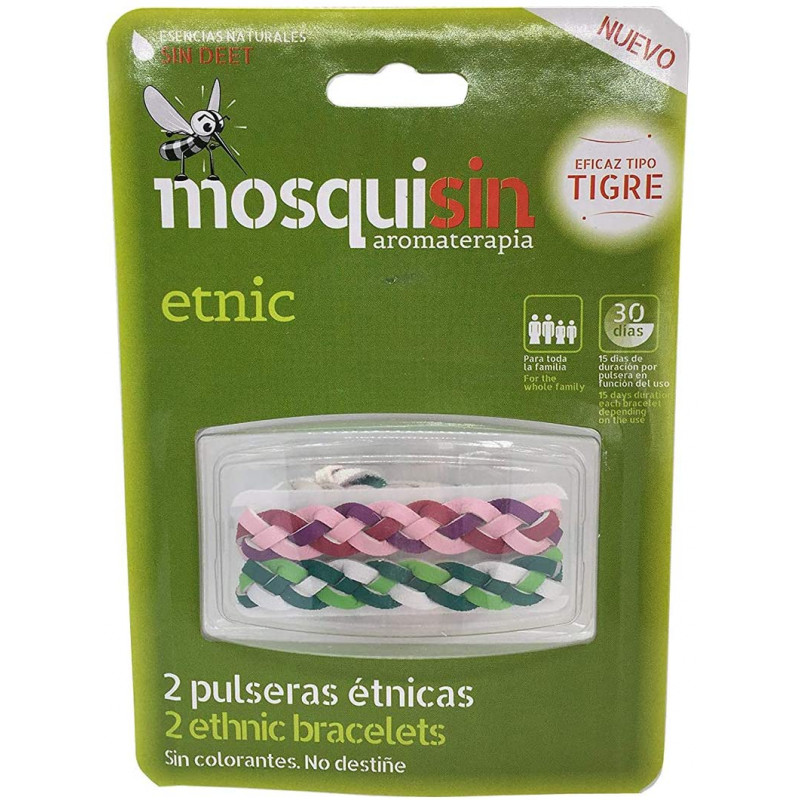 El pack de dos pulseras antimosquitos Mosquisin Etnic está diseñado con un atractivo estilo étnico y elaborado con sustancias naturales. Estas pulseras son adecuadas para toda la familia y han demostrado ser eficaces, incluso frente al mosquito tigre.